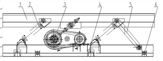 1輸送槽、2主振彈簧、3驅(qū)動(dòng)連桿機(jī)構(gòu)、4底座、5導(dǎo)向桿、6輔助支座。